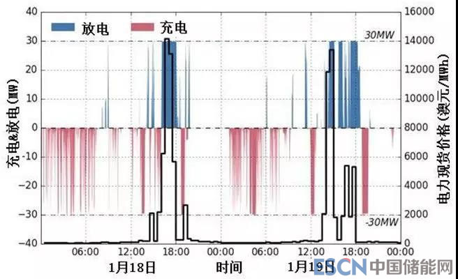 由于2018年1月18日B1機(jī)組跳閘后造成了供小于求的供電緊張。維州和南澳州的電力現(xiàn)貨價(jià)格猛漲至12900澳元/MWh和14200澳元/MWh。Tesla儲(chǔ)能選擇在價(jià)格尖峰時(shí)刻的出力獲得了巨大的經(jīng)濟(jì)收入。圖7為2018 年1月18日-1月19日Tesla出力與現(xiàn)貨市場(chǎng)價(jià)格波動(dòng)對(duì)比。其中藍(lán)色放電曲線(xiàn)和紅色充電曲線(xiàn)對(duì)應(yīng)左側(cè)充放電功率(MW);黑色價(jià)格曲線(xiàn)對(duì)應(yīng)右側(cè)現(xiàn)貨價(jià)格(澳元/MWh)。圖6中Tesla在1月18日17:00-18:00和1月19日14:00-17:00 價(jià)格上升期集中放電,在其余價(jià)格較低時(shí)段充電,在時(shí)間軸上利用自身快速的充放電性能曲線(xiàn)跟隨現(xiàn)貨價(jià)格波動(dòng)曲線(xiàn),低買(mǎi)高賣(mài)盈利。