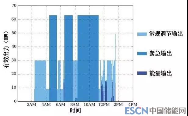 根據(jù)文獻(xiàn)[10][11]的描述,圖3為2017年12月9日Tesla儲(chǔ)能投運(yùn)后的出力情況。由圖3可知,Tesla實(shí)際提供3種有償輔助服務(wù):(1)常規(guī)調(diào)節(jié)輸出、(2)緊急輸出、(3)能量輸出。常規(guī)調(diào)節(jié)最大輸出30MW/90MWh,其余 70MW/39MWh由緊急輸出和能量輸出構(gòu)成[10][11]。在PowerPack儲(chǔ)能單元中常規(guī)調(diào)節(jié)、緊急輸出和能量輸出擁有各自獨(dú)立的控制策略:(1)常規(guī)調(diào)節(jié)輸出以有功和無(wú)功功率為控制目標(biāo),通過(guò)內(nèi)外雙環(huán)控制調(diào)節(jié)HPR輸出功率。(2)緊急輸出以電壓和頻率為控制目標(biāo),并在內(nèi)環(huán)控制前端設(shè)置了頻率變化感知算法,當(dāng)外環(huán)故障導(dǎo)致系統(tǒng)頻率出現(xiàn)大幅波動(dòng)后自動(dòng)觸發(fā)內(nèi)環(huán),輸出有功功率以維持系統(tǒng)頻率穩(wěn)定。(3)能量輸出控制是基于電力市場(chǎng)價(jià)格信號(hào)變化的有功和無(wú)功功率雙環(huán)控制,外環(huán)由Tesla對(duì)現(xiàn)貨市場(chǎng)的電力價(jià)格進(jìn)行預(yù)判觸發(fā),內(nèi)環(huán)為有功無(wú)功功率輸出。