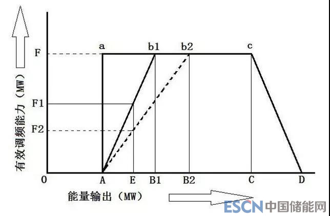 以下具體說(shuō)明:圖1為傳統(tǒng)火電機(jī)組和儲(chǔ)能的調(diào)頻特性對(duì)比。橫坐標(biāo)為輸出有功功率,縱坐標(biāo)為對(duì)應(yīng)機(jī)組輸出功率的機(jī)組調(diào)頻能力??梢?jiàn),傳統(tǒng)火電機(jī)組的調(diào)頻能力在A(yíng)點(diǎn)開(kāi)始隨輸出增加而增加,在b1或b2點(diǎn)達(dá)到調(diào)頻能力峰值F,峰值持續(xù)至C點(diǎn)并下落,在D點(diǎn)降至0。不同機(jī)組的調(diào)頻特性不同造成斜率不同(Ab1和Ab2)。而儲(chǔ)能以其放電特性可在輸出初始極短時(shí)間內(nèi)(通常為1s內(nèi))從A點(diǎn)達(dá)到a點(diǎn)獲得調(diào)頻峰值F并持續(xù)。發(fā)電商“延期交易”的做法是在不改變總體輸出有功功率的情況下將A機(jī)組的輸出(Ab1)轉(zhuǎn)移至B機(jī)組(Ab2):即將A機(jī)組出力較少,B機(jī)組出力增加A機(jī)組減少的值,從而在E點(diǎn)處減少多臺(tái)機(jī)組的調(diào)頻能力之和(從F1到F2)。發(fā)電商此時(shí)不交易,等待輔助服務(wù)供給短缺造成了輔助服務(wù)價(jià)格上漲之后再“重復(fù)報(bào)價(jià)”,按已上漲的價(jià)格結(jié)算獲取巨額利潤(rùn)。