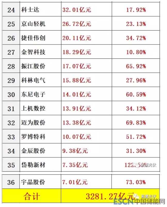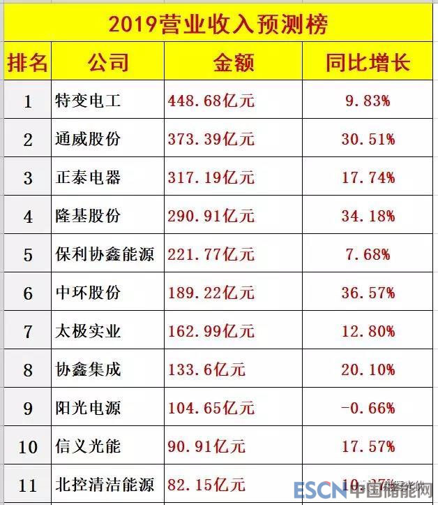據(jù)第三方研究機構(gòu)預測及黑鷹光伏統(tǒng)計,2019年這36家光伏上市公司是營業(yè)收入總計3281.27億元,9家公司營收將在百億以上,其中榜單前三名為特變電工、通威股份和正泰電器,預計三者2019年營業(yè)收入將分別達到448.68億元、373.39億元和317.19億元;