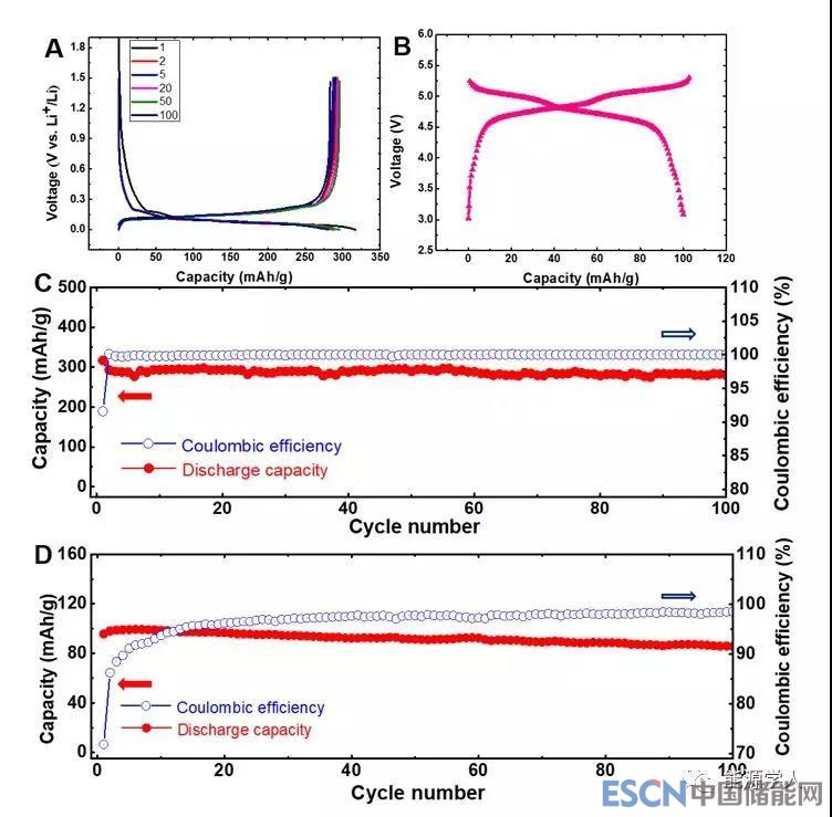圖6.(A)石墨充放電曲線,電流密度為0.1A/g;(B)在1C倍率下,石墨//LiCoMnO4電池充放電曲線;(C)石墨循環(huán)性能,電流密度為0.1A/g;(D)石墨//LiCoMnO4電池循環(huán)性能,倍率為1C。