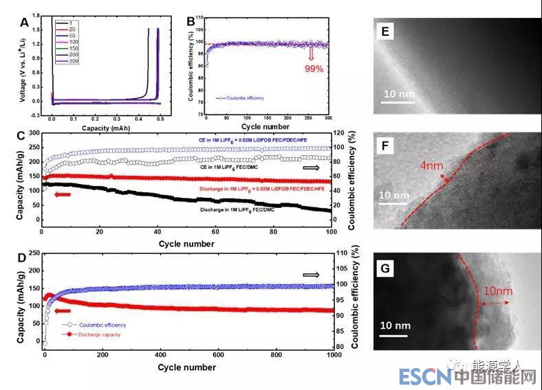 圖5.(A)Li金屬沉積充放電曲線,電流密度為0.5mA/cm2;(B)Li金屬沉積庫倫效率,電流密度為0.5mA/cm2;(C)Li//LiCoMnO4電池在不同電解液中循環(huán)性能比較(1M LiPF6 + 0.02M LiDFOB in FEC/FDEC/HFE 或者1 M LiPF6in FEC/DMC ),電流密度為0.1A/g; (D)Li//LiCoMnO4電池循環(huán)性能,電流密度為1A/g;(E)原始LiCoMnO4 TEM圖;(F)在1 M LiPF6 + 0.02M LiDFOB in FEC/FDEC/HFE 電解液中100圈循環(huán)后LiCoMnO4TEM圖;(G)在1M LiPF6 in FEC/DMC 電解液中100圈循環(huán)后LiCoMnO4 TEM圖。