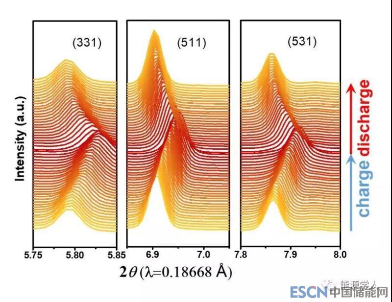 從圖4可以明顯看到,伴隨著鋰離子脫出嵌入,所有的峰僅僅經(jīng)歷偏移,并沒有經(jīng)歷相的消失或者出現(xiàn)新的相。這證明了LiCoMnO4材料經(jīng)歷的是一個固溶體反應機理,這與傳統(tǒng)尖晶石材料LiMn2O4 以及LiNi0.5Mn1.5O4是不一致的。這可以從不同過渡金屬元素發(fā)生價態(tài)變化引起的體積大小變化來解釋:在LiMn2O4 中,Mn3+ (0.645 ?) 到Mn4+(0.53 ?) 經(jīng)歷體積變化0.115 ?;在LiNi0.5Mn1.5O4 中,Ni3+(0.56 ?) 到Ni4+(0.48 ?) 經(jīng)歷體積變化0.08 ?;而在LiCoMnO4 中,Co3+ (0.545 ?) 到Co4+(0.53 ?) 僅僅經(jīng)歷體積變化0.015 ?。如此小的體積變化使其更容易發(fā)生固溶體反應機理。