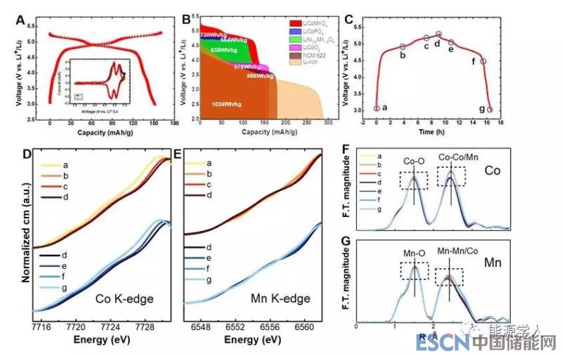 圖3.(A)LiCoMnO4充放電曲線以及循環(huán)伏安圖,電流密度為0.1A/g;(B)LiCoMnO4能量密度與其他高電壓材料對比圖;(C)首圈充放電曲線圖(電流密度為0.02A/g),在不同區(qū)間(a-g)測試非原位XANES譜圖;(D)Co 的XANES圖譜;(E)Mn 的XANES 圖譜;(F)Co 的EXAFS圖譜;(G)Mn 的EXAFS圖譜。