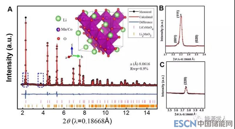 圖1. 合成的LiCoMnO4的 XRD圖譜以及精修圖譜。