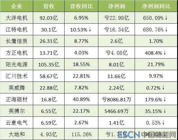 凈利潤方面,除上述3家營收凈利雙增的3家企業(yè)外,其余8家企業(yè)凈利潤全部下降,其中還有5家虧損,虧損金額最高為大洋電機,達到22.98億元,同比下降650%,降幅達到6.5倍。