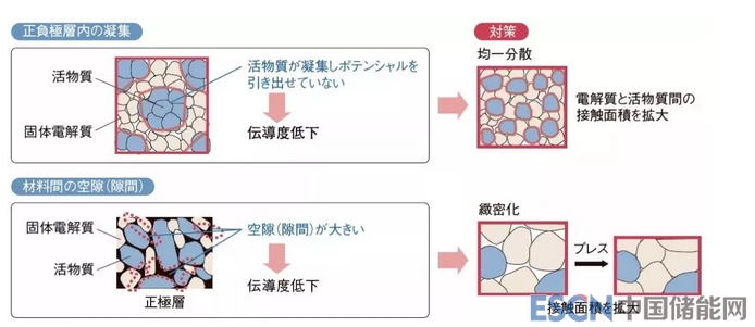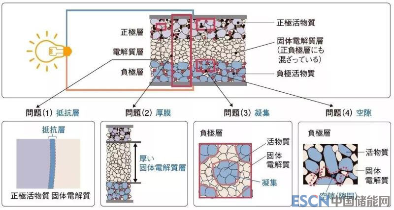 早期研發(fā)的全固態(tài)電池由于輸出密度與能量密度都很低,遠(yuǎn)遠(yuǎn)無法達(dá)到商業(yè)化水平。豐田分析到,造成內(nèi)部阻抗上升的有4大問題:(1)正極內(nèi)的正極活性材料與固體電解質(zhì)界面會(huì)產(chǎn)生電阻層;(2)固體電解質(zhì)層會(huì)變厚;(3)正負(fù)極內(nèi)的活性材料凝集;(4)構(gòu)成正負(fù)極或者電解質(zhì)的固體顆粒之間會(huì)形成空隙。