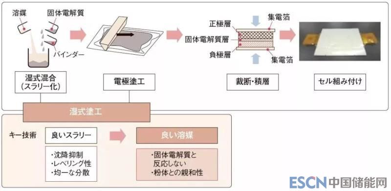 豐田為解決這兩個(gè)問題所采取的對策就是濕涂法:將干燥的粉末在溶劑中分散制備成漿料,將漿料涂布在箔材上然后進(jìn)行干燥的工藝。通過干燥除去溶劑,分別形成正極,固體電解質(zhì)和負(fù)極層。