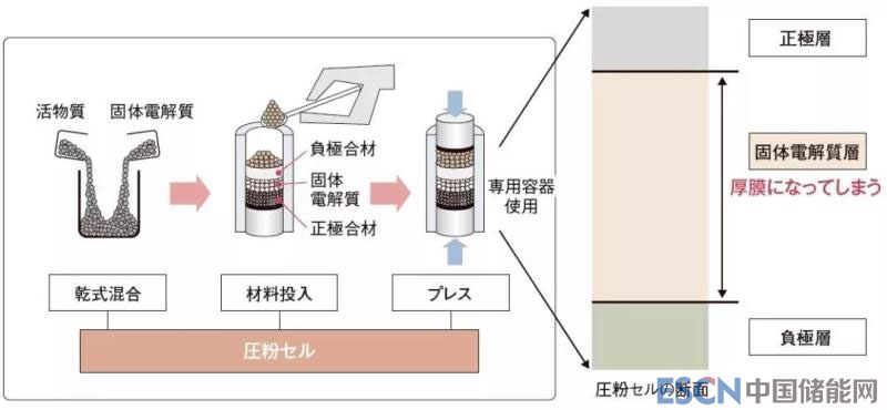 根據(jù)巖瀨先生說法,早期的電解質(zhì)層變厚的原因主要是受限于當(dāng)時(shí)的電芯工藝。在全固態(tài)電池開發(fā)的早期階段,制作的電池是直徑約10mm的紐扣電池。分別用到正極混合材料(正極活性物質(zhì),固體電解質(zhì),導(dǎo)電輔助劑)和固體電解質(zhì),負(fù)極混合材料(負(fù)極活性物質(zhì),固體電解質(zhì)),且將各個(gè)材料的粒子保持干燥的狀態(tài)下依次填充在圓筒狀的容器內(nèi),然后蓋上不銹鋼制的集電器,上下用螺釘擰緊然后進(jìn)行加壓。這樣的方法難以使固體電解質(zhì)變薄,最高的水平就是將厚度保持為300至500μm。
