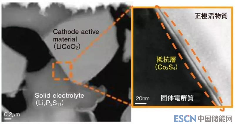 上面提到的界面電阻層,主要是由于正極活性材料中的鈷(Co),鎳(Ni)、錳(Mn)等遷移金屬的擴(kuò)散,與硫化物固體電解質(zhì)中的硫(S)反應(yīng),形成硫化物,而鋰離子無法順利通過該硫化物。