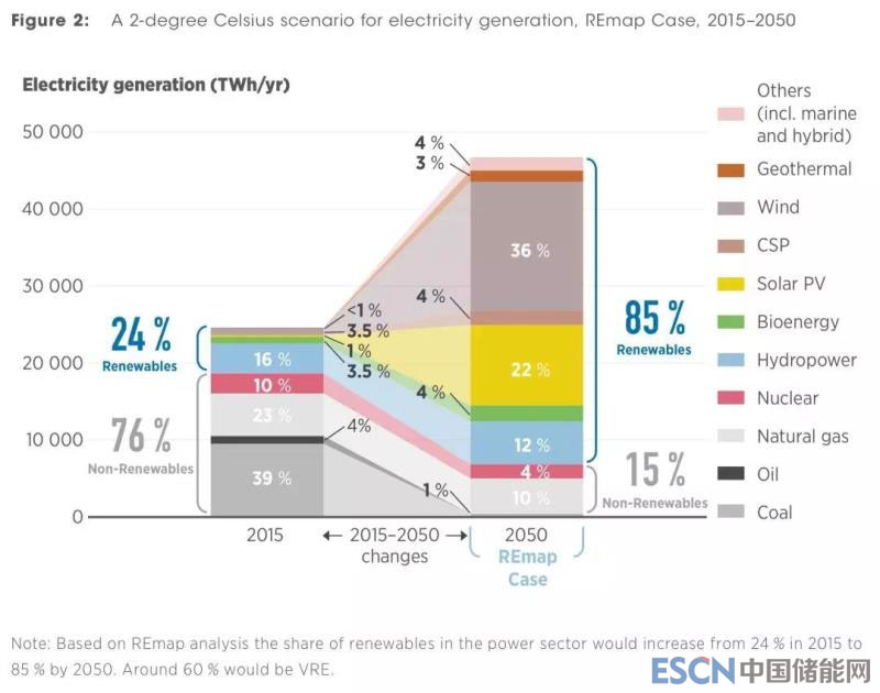 中國(guó)儲(chǔ)能網(wǎng)訊:按照國(guó)際可再生能源署(IRENA)最近發(fā)表的一份報(bào)告中,如果全球溫升控制在2攝氏度以內(nèi),要求2050年全球電力供應(yīng)的85%來(lái)自可再生能源,其中間歇性電源占58%(風(fēng)電36%、光伏22%),其余11%為化石能源、4%為核電。