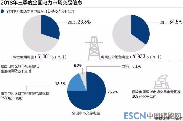 根據(jù)中電聯(lián)發(fā)布的統(tǒng)計數(shù)據(jù),2018年前9個月,全國電力市場交易電量合計為14457億千瓦時,是2015年一整年的一倍還多,市場交易電量占全社會用電量比重近三成,占電網企業(yè)銷售電量比重的三成還多。其中,國家電網區(qū)域市場交易電量規(guī)模10874億千瓦時,占全國市場交易電量的75.2%。