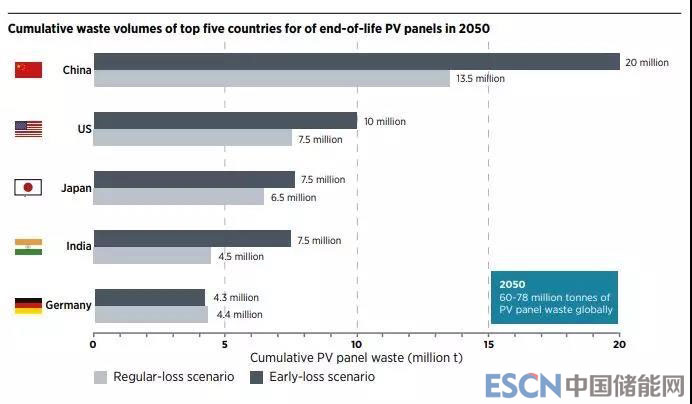 國(guó)際可再生能源署(IRENA)的一項(xiàng)研究證實(shí):到2050年,世界范圍內(nèi)報(bào)廢的光伏電池板數(shù)量將達(dá)到數(shù)千萬噸(特別是在中國(guó)、美國(guó)、日本、印度和德國(guó))——回收后價(jià)值將超過150億美元。