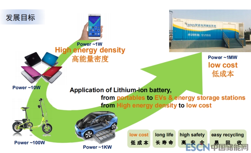 因此我們說儲能電池的發(fā)展,已經(jīng)從當(dāng)初對消費(fèi)類電池的高能量密度的首要要求,逐步轉(zhuǎn)變?yōu)閷Φ统杀镜暮诵囊?。電池在手機(jī)中的使用是剛需,手機(jī)離不開電池,因此電池便宜也好,貴也好,必須要用電池。但是,儲能電池如果太貴的話電力系統(tǒng)可以不用,甚至可以用非儲能的手段解決一些儲能面臨的問題。所以“低成本”成為我們儲能電池發(fā)展的首要目標(biāo)。