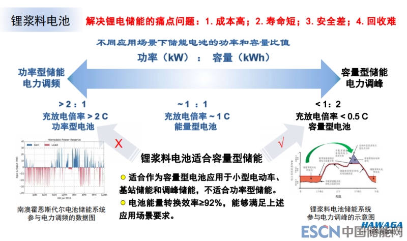 儲能的應(yīng)用場景多元。因此沒有任何一種技術(shù)能把所有的儲能問題解決。鋰漿料電池是典型的容量型電池,不適合在高倍率下運(yùn)用,所以高功率儲能場景需要其他一些新的技術(shù)開發(fā)好應(yīng)用,比如高電壓電池。