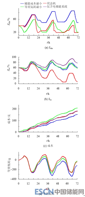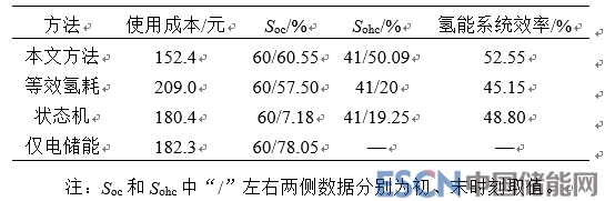 雖然目前尚沒有對(duì)微電網(wǎng)能量管理方法進(jìn)行統(tǒng)一評(píng)估及比較的標(biāo)準(zhǔn),但仍可以引入一些指標(biāo)來(lái)顯示各個(gè)控制策略的優(yōu)缺點(diǎn),幫助對(duì)該能量管理方式進(jìn)行進(jìn)一步評(píng)價(jià)?;诿總€(gè)運(yùn)行周期得出結(jié)果的對(duì)比,可以體現(xiàn)出能量管理系統(tǒng)的性能。本文采用使用成本、Soc、Sohc和氫儲(chǔ)能系統(tǒng)平均效率4個(gè)指標(biāo),對(duì)本文所提出的能量管理方法、等效氫耗方法、狀態(tài)機(jī)方法在相同參數(shù)和工況下進(jìn)行比較;而在僅含有電儲(chǔ)能系統(tǒng)的微電網(wǎng)中,蓄電池的容量調(diào)整為1200 Ah以確保儲(chǔ)能系統(tǒng)的容量滿足系統(tǒng)運(yùn)行的要求,所得結(jié)果如圖9所示。具體指標(biāo)對(duì)比結(jié)果如表3所示。