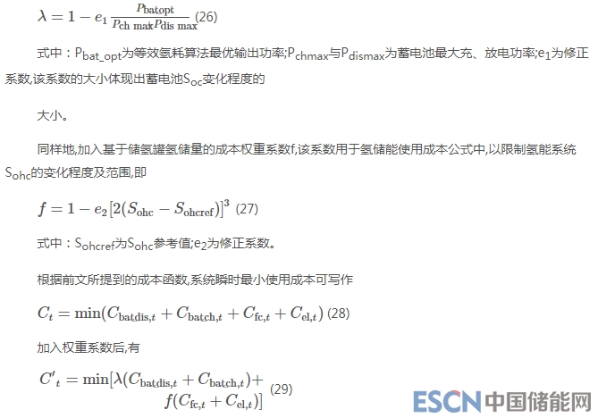 修正系數(shù)e1、e2的大小決定了權(quán)重系數(shù)λ與f變化的快慢,即蓄電池Soc及氫儲(chǔ)能系統(tǒng)Sohc回歸參考值速度的快慢,系數(shù)越大,Soc或Sohc回到參考值的速度越快。因此加入權(quán)重后,儲(chǔ)能系統(tǒng)使用成本根據(jù)儲(chǔ)能情況存在一定波動(dòng),進(jìn)而對(duì)各微源的功率輸出進(jìn)行一定的修正。