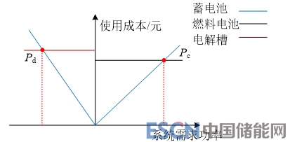 由式(22)可知,蓄電池使用成本與其輸出功率線性相關(guān),而氫儲(chǔ)能系統(tǒng)使用成本在額定功率范圍內(nèi)不變化,則瞬時(shí)狀態(tài)下蓄電池與氫能系統(tǒng)使用成本與功率關(guān)系可如圖4所示。