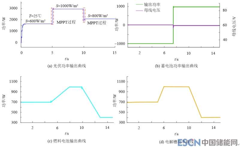 由仿真結(jié)果可以得出,能量管理系統(tǒng)能夠?yàn)楦鲀?chǔ)能系統(tǒng)有效地進(jìn)行功率分配,當(dāng)光伏陣列輸出大于負(fù)載需求時(shí),儲(chǔ)能系統(tǒng)開始儲(chǔ)能,系統(tǒng)根據(jù)使用成本最小原則為各系統(tǒng)分配功率;當(dāng)光伏輸出不足以維持負(fù)載需求或者夜間光伏系統(tǒng)無(wú)輸出時(shí),系統(tǒng)按照儲(chǔ)能系統(tǒng)自身儲(chǔ)能狀況及使用成本讓儲(chǔ)能系統(tǒng)進(jìn)行合理地放電。同時(shí),由于變流器層對(duì)燃料電池、電解槽功率瞬時(shí)變化程度的限制,其運(yùn)行過(guò)程中功率輸入、輸出較為平穩(wěn),且不存在頻繁啟停的現(xiàn)象,而蓄電池根據(jù)下垂控制的特性,響應(yīng)更為迅速,出力則更加靈活,符合其運(yùn)行特性。