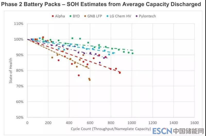 根據(jù)ITP Renewables公布測(cè)試結(jié)果,比亞迪Battery-Box電池組(綠色虛線)的容量衰減程度在測(cè)試組中排名最低