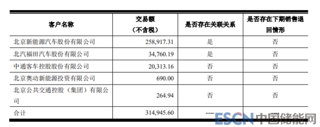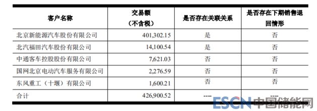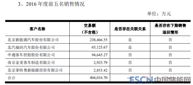 2016年,普萊德前五大客戶營(yíng)收約為40.4億元(全部營(yíng)收40.97億元),其第一大客戶和第三大客戶,分別是北汽新能源、福田汽車,分別實(shí)現(xiàn)銷售額約為23.85億元、6.51億元,合計(jì)約占普萊德該年前五大客戶營(yíng)收的75.15%(注:以上交易額均不含稅)。