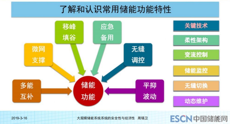 剛才前面我們秘書長,還有陳老師這兩個方面的報告已經(jīng)涵蓋了方方面面的很多內(nèi)容,秘書長的報告是從儲能系統(tǒng)和電化學(xué)儲能目前的應(yīng)用狀況和發(fā)展上,很高度的概括了當(dāng)前的情況,陳老師從技術(shù)上面把各個環(huán)節(jié),實際上講得很透,特別是技術(shù)研究方面講得很透。他們講完之后為了不沖突,我重點講的是大規(guī)模儲能應(yīng)用和設(shè)計和建設(shè)過程中的一些體會。功能性能特點,儲能上關(guān)鍵技術(shù)的幾個點。