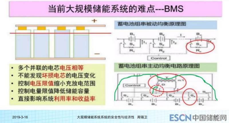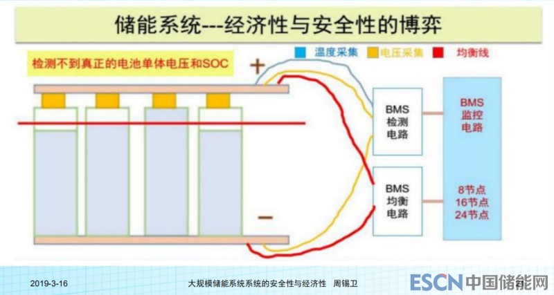 創(chuàng)新技術(shù),這一塊是非常重要的,目前講儲能系統(tǒng)里面實際上全球都是一樣,在大規(guī)模儲存里面沒有太多的創(chuàng)新技術(shù),都是其他技術(shù)移過來,比如說電動汽車的儲能管理技術(shù)?,F(xiàn)在國內(nèi)的BMS大部分采用的都是汽車BMS里面的專用芯片,所以成本比較高。在高成本情況下,怎么樣能夠配合在儲能里,把幾顆電芯并起來,并起來成本越低,檢測一個點芯片的成本固定了,你的電芯多的并在一起就會減低整體成本,但是帶來一個致命的危害,幾顆并在一起,這個電位,大家都學(xué)過電路最基本的原理,并聯(lián)的電路測出來的電位是一樣的,所以并有一顆偏低或者有一顆偏高,你測不到這一顆,也就違反了BMS保護(hù)電芯能測到每一顆最壞的電芯。在這種情況下采取保護(hù)測試,這個初衷就不對,這個情況下經(jīng)濟(jì)性嚴(yán)重影響了儲能系統(tǒng)的壽命。