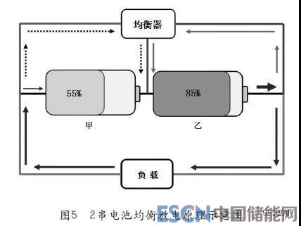 如果電池容量差異不是非常大,并且均衡電流足夠大,均衡效率足夠高,則所有電池基本上可以同時(shí)放完電,電池容量得到充分利用。2串電池放電均衡原理示意圖如圖5所示。