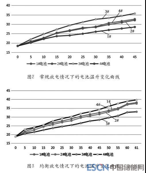 本實(shí)驗(yàn)電池組的一致性問題非常嚴(yán)重,在沒有本文中的電池均衡器情況下,能夠安全充入的最大電量取決于3#電池,3#電池由于容量最小,最先充滿電,如果沒有安全充電控制,很快就會(huì)進(jìn)入過充電狀態(tài),使電池受損;放電時(shí),其可放出的電量同樣取決于3#電池的容量,3#電池最先放完電,如果沒有安全放電控制,隨后就會(huì)進(jìn)入過放電狀態(tài),使電池進(jìn)一步受損,反復(fù)充放電后,3#電池的容量將進(jìn)一步快速衰減。3#電池在容量嚴(yán)重衰減的情況下,還會(huì)伴生另一個(gè)嚴(yán)重問題,那就是內(nèi)阻進(jìn)一步快速上升。對(duì)于蓄電池來說,內(nèi)阻越小越好,內(nèi)阻的上升會(huì)使電池在大電流充電或放電時(shí)溫度快速升高,溫升對(duì)于蓄電池副作用很大,特別是過高的溫升不僅加速電池的衰減,嚴(yán)重影響和縮短蓄電池的使用壽命,嚴(yán)重的還會(huì)引發(fā)熱失控故障。在本電池組中,標(biāo)準(zhǔn)充放電情況下,3#電池的溫升始終處于最高,進(jìn)一步加速其衰減。