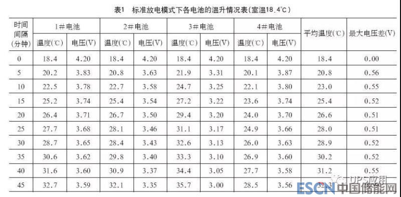 為便于對(duì)比,先進(jìn)行常規(guī)放電,實(shí)測(cè)有效安全放電時(shí)間為45min,計(jì)算放電容量為1.50Ah,等于3#電池的容量,即3#電池的容量代表了整個(gè)電池組的容量,完全符合木桶短板理論。此時(shí),其它3塊電池雖然還有較多電量,但無法釋放出來,容量浪費(fèi)嚴(yán)重。放電的同時(shí),采用紅外線測(cè)溫儀定時(shí)對(duì)每一塊電池的外殼進(jìn)行溫度測(cè)量,并記錄相應(yīng)數(shù)據(jù),實(shí)際測(cè)量數(shù)據(jù)見表1,實(shí)測(cè)溫度數(shù)據(jù)表明,衰減最嚴(yán)重的3#電池的溫升速度和絕對(duì)值均明顯高于其它衰減程度稍低的電池。