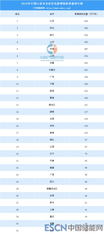 分地區(qū)來看,2018年全國光伏發(fā)電新增裝機容量排名第一的省市為江蘇省,新增裝機容量達425萬千瓦,排名前十省市依次為江蘇、河北、浙江、山東、河南、山西、安徽、內蒙古、廣東、寧夏。