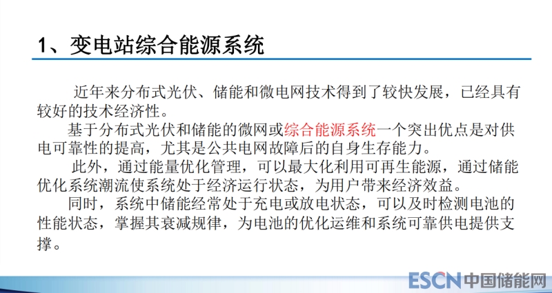 深圳局也是提出向綜合能源服務(wù)公司全面轉(zhuǎn)型的方案,圍繞源網(wǎng)核儲的能源產(chǎn)業(yè)鏈,這里面在儲能上面還是定位很大的重要舉措。相應(yīng)在變電和配電部分之前也做了一些規(guī)劃,交流一下變電的綜合能源系統(tǒng),實際上從變電站這個弱點開始,我們已經(jīng)陸陸續(xù)續(xù)開展了一系列工作,這是一個系統(tǒng),我們原有第一部分智能變電站對于電源的要求,現(xiàn)在要求越來越高。甚至維修、城市集中的或者偏遠(yuǎn)的特定場合下,這個電源的可靠性完全可以決定于電網(wǎng),整個智能電網(wǎng),整個網(wǎng)架的形狀。一個立足點首先把它的站用電源可靠性提高起來,我們是不是現(xiàn)有的容量擴大,可靠性再怎么提升?另外在這里面我們因地制宜,能不能用一些風(fēng)能、光伏,深圳我們試了一個,太陽能光,是一個良性循環(huán),一旦太陽比較充分的時候,這時候變壓器冷卻負(fù)荷比較重,有一部分光伏能量給抵消了,整個站點可靠性各方面,而且光伏板放在主控室上面,主控室的溫度可以降下來。