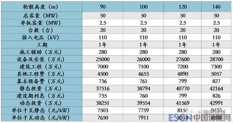 某山西省低海拔山區(qū),裝機容量為50MW,風機選型:2.5MW, 輪轂高度分別為90、100、120、140m。項目接入110kV電壓等級,配套新建一座110kV升壓站,不考慮送出工程費用。出資方式:資本金20%,銀行貸款80%,貸款利率4.9%,建設期1年。概算水平測算數(shù)據(jù)如表7所示。