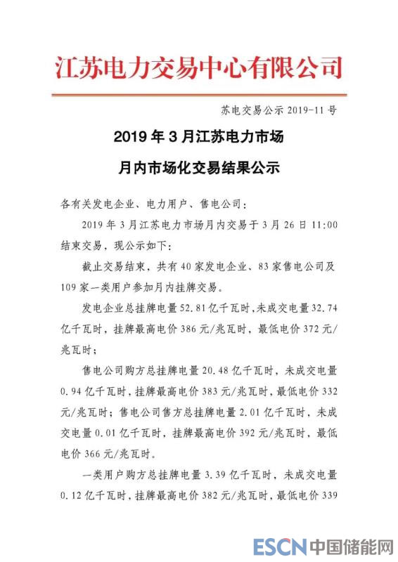 2019年3月江蘇電力市場月內(nèi)市場化交易結(jié)果公示