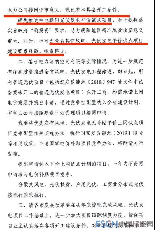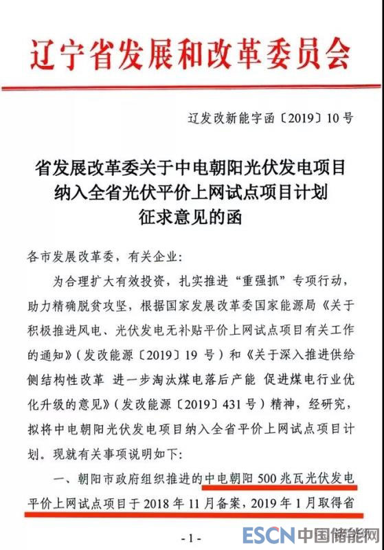 2019年3月22日,遼寧省下發(fā)的《關(guān)于中電朝陽光伏發(fā)電項(xiàng)目納入全省光伏平價(jià)上網(wǎng)試點(diǎn)項(xiàng)目計(jì)劃征求意見的函》中提到: