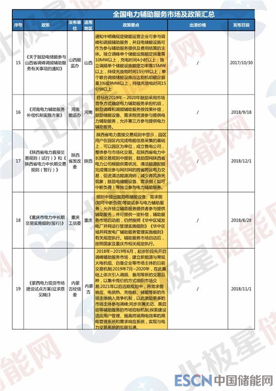 經(jīng)統(tǒng)計(jì)整理,目前京津唐及新疆、福建等共17個(gè)省份或區(qū)域發(fā)布了針對(duì)電力輔助服務(wù)市場(chǎng)運(yùn)營(yíng)規(guī)則的政策。其中已有新疆、甘肅、寧夏、廣東等多省份17份政策文件中明確鼓勵(lì)建設(shè)電儲(chǔ)能設(shè)施、以第三方參與電力輔助服務(wù)并分?jǐn)傁鄳?yīng)的補(bǔ)償費(fèi)用(如圖中背景標(biāo)注黃色內(nèi)容)。其他山東、四川、京津唐等地區(qū)還重點(diǎn)提出風(fēng)電、光伏等參與電力輔助服務(wù)相關(guān)細(xì)則。