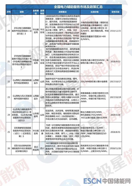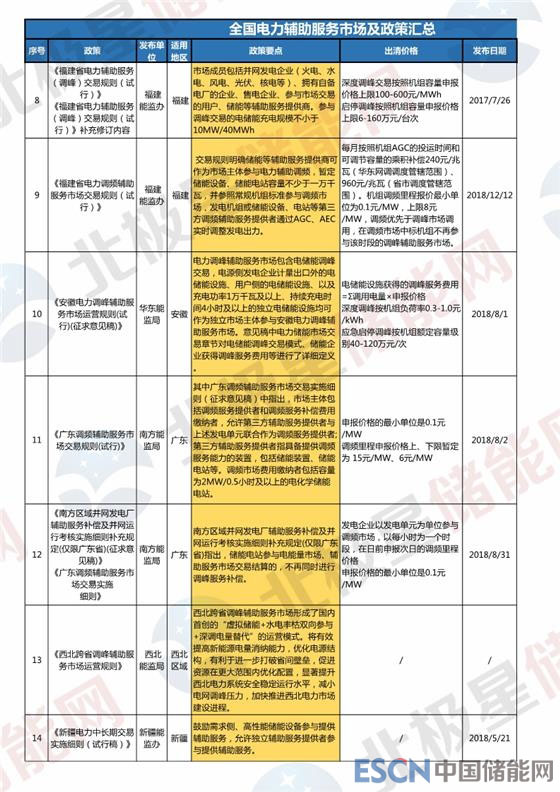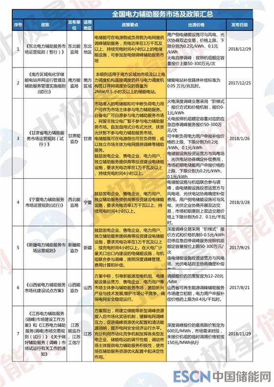 2017年國(guó)家能源局將東北、山西、福建、山東、新疆、寧夏、廣東、甘肅等8個(gè)地點(diǎn)作為第一批電力輔助服務(wù)市場(chǎng)試點(diǎn),2018年多省陸續(xù)又發(fā)布了電力輔助服務(wù)市場(chǎng)開(kāi)啟運(yùn)營(yíng)規(guī)則,儲(chǔ)能可參與的電力輔助服務(wù)市場(chǎng)范圍進(jìn)一步擴(kuò)大。