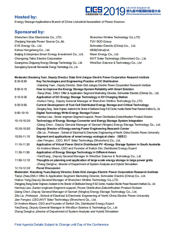 大會(huì)將設(shè)置開(kāi)幕式暨中國(guó)儲(chǔ)能與電力體制改革、國(guó)際儲(chǔ)能與市場(chǎng)、儲(chǔ)能電站與技術(shù)應(yīng)用(四個(gè)專場(chǎng))、儲(chǔ)能成本與投融資、儲(chǔ)能電池與技術(shù)應(yīng)用(兩個(gè)專場(chǎng))、微電網(wǎng)與儲(chǔ)能、氫儲(chǔ)能與燃料電池、能源互聯(lián)網(wǎng)與多能互補(bǔ)、綜合能源服務(wù)、電動(dòng)汽車與電網(wǎng)互聯(lián)、《2019儲(chǔ)能產(chǎn)業(yè)應(yīng)用研究報(bào)告》發(fā)布等15個(gè)專場(chǎng)論壇。