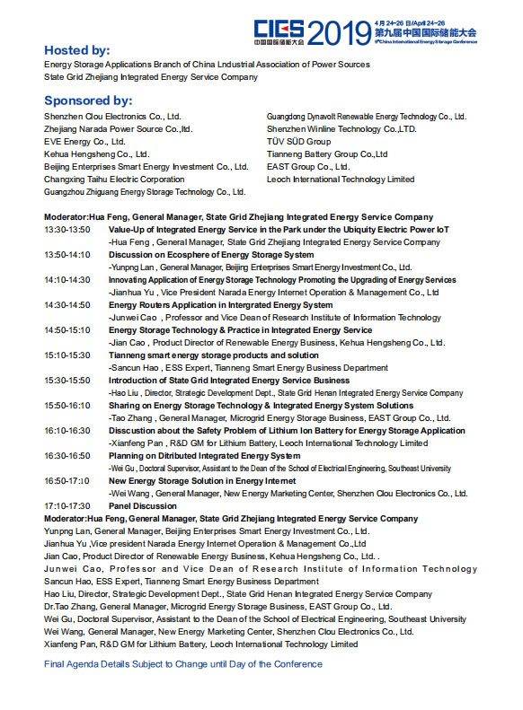 大會(huì)將設(shè)置開(kāi)幕式暨中國(guó)儲(chǔ)能與電力體制改革、國(guó)際儲(chǔ)能與市場(chǎng)、儲(chǔ)能電站與技術(shù)應(yīng)用(四個(gè)專場(chǎng))、儲(chǔ)能成本與投融資、儲(chǔ)能電池與技術(shù)應(yīng)用(兩個(gè)專場(chǎng))、微電網(wǎng)與儲(chǔ)能、氫儲(chǔ)能與燃料電池、能源互聯(lián)網(wǎng)與多能互補(bǔ)、綜合能源服務(wù)、電動(dòng)汽車與電網(wǎng)互聯(lián)、《2019儲(chǔ)能產(chǎn)業(yè)應(yīng)用研究報(bào)告》發(fā)布等15個(gè)專場(chǎng)論壇。
