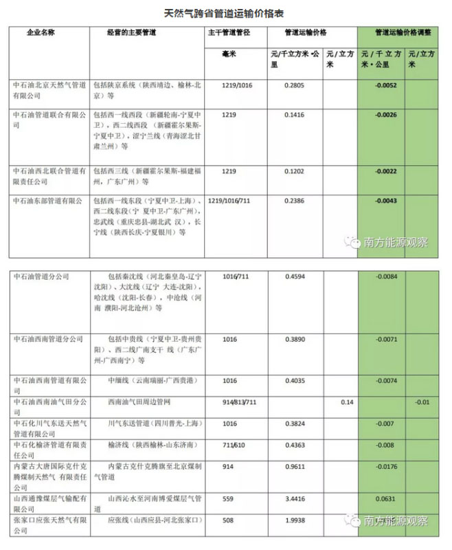 天然氣跨省管道運(yùn)輸價(jià)格表