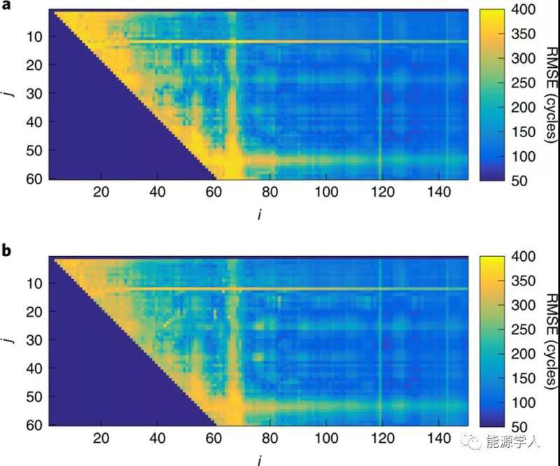最后,作者還進(jìn)行了額外的分析,以了解在回歸設(shè)置中ΔQ(V)的特征選擇受周期指數(shù)的影響。作者研究了僅使用主要測(cè)試數(shù)據(jù)集的Qi(V) –Qj(V)方差單變量線性模型,如上圖所示??梢钥闯?,該模型對(duì)i>60的索引方案不是很敏感,表明使用更早的周期進(jìn)行精確預(yù)測(cè)周期壽命是完全可能的。作者假設(shè),模型對(duì)索引方案的不敏感性意味著周期數(shù)的線性退化,而周期數(shù)通常為L(zhǎng)AM模式。