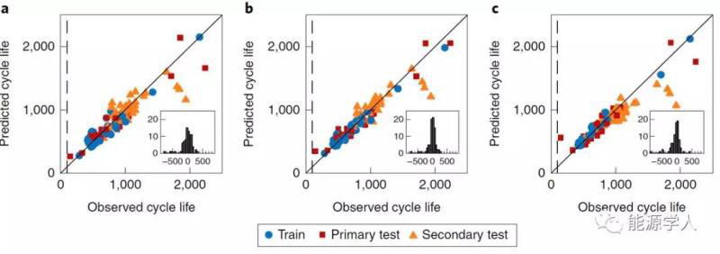 作者將本文中使用早期周期數(shù)據(jù)對(duì)循環(huán)壽命的預(yù)測(cè)性能,與之前的文獻(xiàn)中的na?ve模型進(jìn)行比較。在本文中,使用相關(guān)容量增加0.2%的中位數(shù),通過早期循環(huán)的電壓曲線,對(duì)電池的循環(huán)壽命實(shí)現(xiàn)了準(zhǔn)確的預(yù)測(cè)。而以前報(bào)導(dǎo)的模型,在預(yù)測(cè)精度上與本文相差25%。如果使用之前報(bào)導(dǎo)的模型對(duì)電池平均周期壽命進(jìn)行預(yù)測(cè),則主要和次要測(cè)試集的平均誤差分別約為30%和36%。