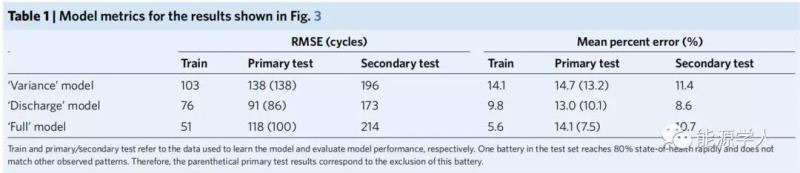 作者提出了三個(gè)模型來預(yù)測(cè)循環(huán)壽命使用的候選特征集大小,第一個(gè)模型稱為“方差”模型,不考慮子集選擇,只使用ΔQ100-10(V)的對(duì)數(shù)方差進(jìn)行預(yù)測(cè)。令人驚訝的是,僅使用這個(gè)模型會(huì)導(dǎo)致在主數(shù)據(jù)集上存在大約15%的平均誤差,在輔助數(shù)據(jù)集上存在大約11%的平均誤差。第二個(gè)“放電”模型考慮了從前100個(gè)循環(huán)放電期間的電壓和電流測(cè)量中獲得的額外信息進(jìn)行預(yù)測(cè),在13個(gè)特征集中,作者選擇了6個(gè)。最后,第三個(gè)“完整”模型考慮了所有可用的特性,在這個(gè)模型中,20個(gè)特征集中有9個(gè)被選中。正如預(yù)期的那樣,通過增加額外特性,主測(cè)試平均誤差降低到7.5%,次測(cè)試平均誤差下降到10.7%。詳細(xì)數(shù)據(jù)如上表所示。