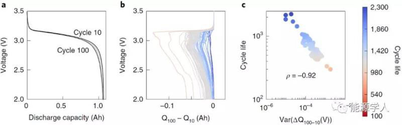 上圖a,b表示電池在前1000個(gè)循環(huán)中的放電容量,可以看到,在最初的100個(gè)循環(huán)中,容量衰減可以忽略不計(jì),但是隨著時(shí)間的增加,容量衰減開始加速,正如我們經(jīng)常在電子產(chǎn)品中觀察到的那樣。容量衰減的軌跡交叉說明了初始容量與循環(huán)壽命之間的弱關(guān)系,比如第二個(gè)循環(huán)(相關(guān)性ρ=?0.06,圖d)和第100個(gè)循環(huán)(ρ=0.27,圖e)的循環(huán)壽命對(duì)數(shù),與第100個(gè)循環(huán)(ρ=0.47,圖f)附近的容量衰減率之間存在很弱的相關(guān)性。由于容量衰減曲線中的相關(guān)性很弱,因此其預(yù)測(cè)能力有限。作者隨后采用了一種新的數(shù)據(jù)驅(qū)動(dòng)方法,該方法考慮了更大的循環(huán)數(shù)據(jù),包括每個(gè)循環(huán)的全電壓曲線,以及電池內(nèi)阻和溫度等附加測(cè)量。