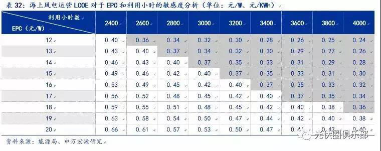 技術(shù)進(jìn)步疊加成本下降,未來海上風(fēng)電實(shí)現(xiàn)平價(jià)上網(wǎng)可期。根據(jù)度電成本的敏感性分析,固定EPC成本,利用小時(shí)數(shù)越高,度電成本越低;同樣,固定利用小時(shí)數(shù),EPC成本越低,度電成本越低。當(dāng)EPC成本為16元/W,利用小時(shí)數(shù)從2400增長至3600,海上風(fēng)電場度電成本從0.51元/KWh降低到0.34元/KWh。當(dāng)利用小時(shí)數(shù)固定為3200,EPC成本從18元/W降至14元/W,海上風(fēng)電的度電成本從0.45元/KWh降低到0.35元/KWh。隨著單機(jī)功率的增大與葉片直徑的加長,海上風(fēng)電將逐步達(dá)到經(jīng)濟(jì)規(guī)?;l(fā)展,未來實(shí)現(xiàn)平價(jià)上網(wǎng)可期。