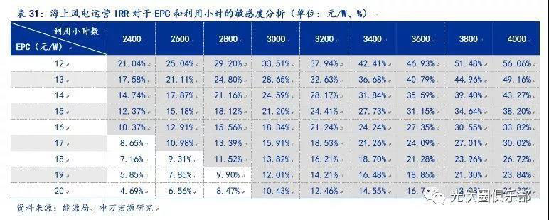 技術(shù)進(jìn)步疊加成本下降,海上風(fēng)電內(nèi)部收益率有較大的提升空間。根據(jù)內(nèi)部收益率的敏感性分析,固定EPC成本,利用小時(shí)數(shù)越高,內(nèi)部收益率越高;同樣,固定利用小時(shí)數(shù),EPC成本越低,內(nèi)部收益率越高。當(dāng)EPC成本為16元/W,利用小時(shí)數(shù)從2400增長至3600,海上風(fēng)電場內(nèi)部收益率從11.86%提升到29.48%。當(dāng)利用小時(shí)數(shù)固定為3200,EPC成本從18元/W降至14元/W,海上風(fēng)電的內(nèi)部收益率從16.21%提升到28.17%。