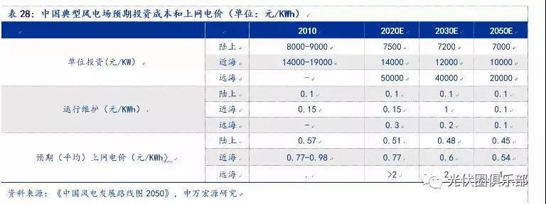 海上風(fēng)電未來成本下行,經(jīng)濟(jì)競爭力顯著提升。受益于風(fēng)電的技術(shù)進(jìn)步和規(guī)模擴(kuò)大,風(fēng)電機(jī)組價(jià)格、風(fēng)電開發(fā)投資成本及運(yùn)行維護(hù)成本呈現(xiàn)不斷下降趨勢。目前近海風(fēng)電的投資是陸上風(fēng)電的1.5-2倍,大約為14000-19000元/KW,預(yù)計(jì)2020、2030和2050年降至14000、12000和10000元/KW。目前近海風(fēng)電的運(yùn)行維護(hù)成本是陸上風(fēng)電的1.5倍,未來有望持續(xù)降低。
