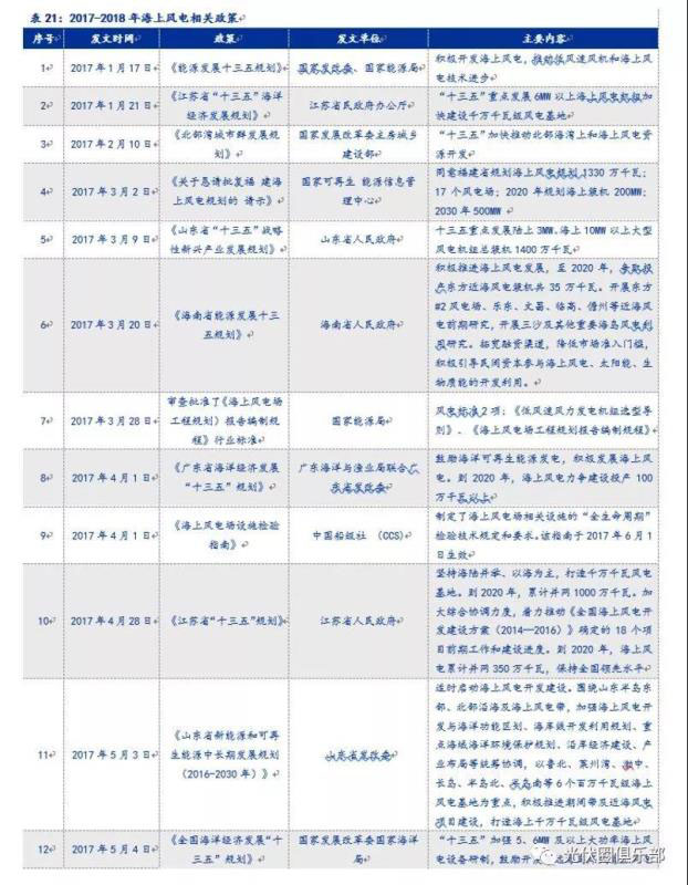 可再生能源配額考核和綠色證書交易機(jī)制將是未來能源轉(zhuǎn)型的有效市場化措施??稍偕茉措娏ε漕~考核制度及配套的綠色電力證書交易機(jī)制是國際上普遍采用的可再生能源產(chǎn)業(yè)扶持政策,配額制可以有效解決補(bǔ)貼標(biāo)準(zhǔn)和退出的問題,綠色電力證書交易有效緩解財(cái)政缺口,引導(dǎo)價(jià)格走向市場化。目前,綠色電力證書已于2017年7月1日正式開展認(rèn)購工作。2017年4月, 2020全國各省可再生能源配額制出臺(tái);2017年11月,發(fā)改委、能源局正式印發(fā)《解決棄水棄風(fēng)棄光問題實(shí)施方案》,特別提到“《可再生能源電力配額及考核辦法》另行發(fā)布”。2018年3月國家能源局發(fā)布《可再生能源電力配額及考核辦法(征求意見稿)》,配額制有望于2018年正式出臺(tái)。目前,綠證制度主要是面對成本較低的新能源項(xiàng)目,主要是陸上風(fēng)電項(xiàng)目。由于海上風(fēng)電初始投資大、建設(shè)周期長、投資風(fēng)險(xiǎn)較高,執(zhí)行綠證交易可能給項(xiàng)目收益帶來一定波動(dòng)風(fēng)險(xiǎn),目前海上風(fēng)電沒有納入綠證核發(fā)對象,但實(shí)行綠證將是走向市場化的必然趨勢。