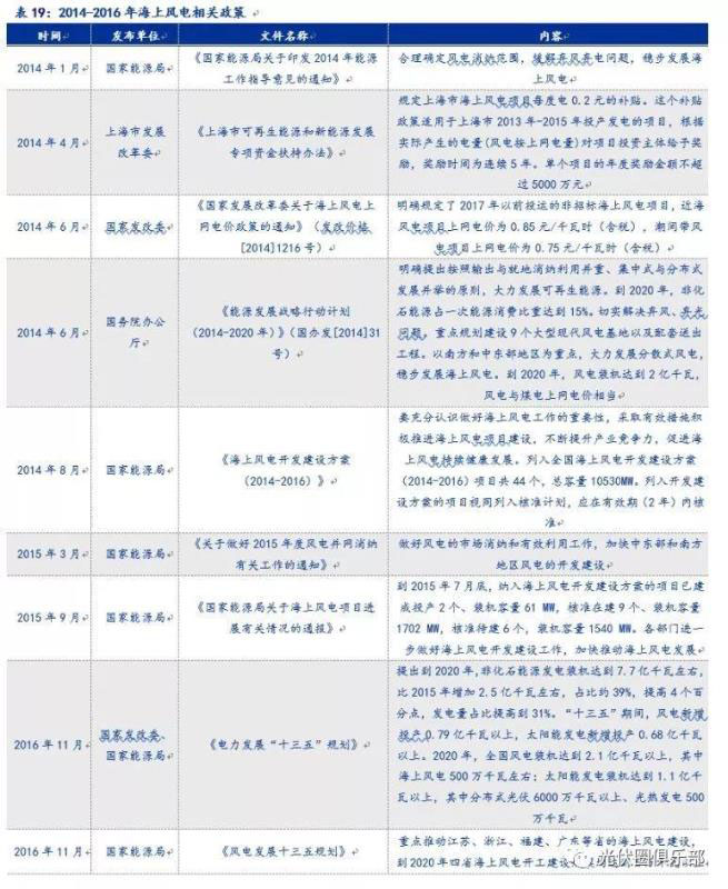 2014-2016年海上風(fēng)電進(jìn)入快速發(fā)展期,海上風(fēng)電政策導(dǎo)向逐步明確。2014年被業(yè)界稱為“海上風(fēng)電元年”,經(jīng)歷了爆發(fā)式增長,新增裝機(jī)量達(dá)230MW,同比增長283%;2015-2016年進(jìn)入快速發(fā)展階段,海上風(fēng)電年新增裝機(jī)量分別為360MW、590MW,增長率分別為57%、64%。根據(jù)2014年8月能源局公布的《海上風(fēng)電開發(fā)建設(shè)方案(2014-2016)》,共計(jì)納入項(xiàng)目44個(gè),總?cè)萘?0530MW。列入開發(fā)建設(shè)方案的項(xiàng)目視同列入核準(zhǔn)計(jì)劃,應(yīng)在有效期(2年)內(nèi)核準(zhǔn)。2014-2016年期間,已建成投運(yùn)9個(gè)海上風(fēng)電項(xiàng)目,共計(jì)約1005MW。同時(shí)在此階段海上風(fēng)電政策導(dǎo)向逐步明確,政策逐漸由風(fēng)電政策細(xì)分至海上風(fēng)電政策。