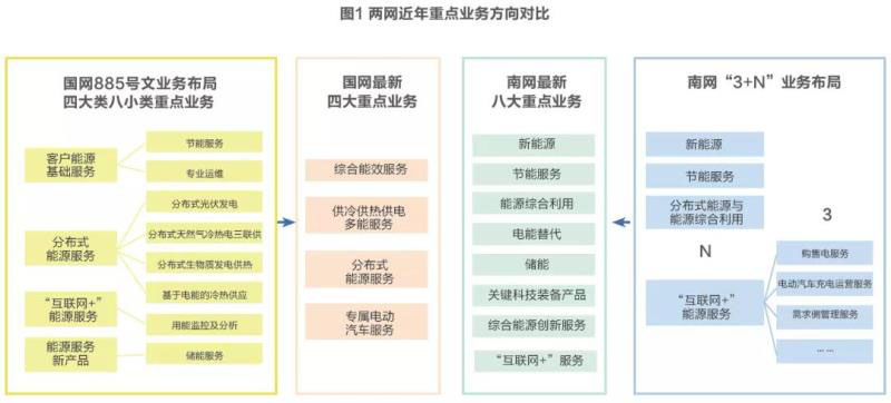 經(jīng)過(guò)近兩年摸索與實(shí)踐,兩網(wǎng)均對(duì)綜合能源服務(wù)重點(diǎn)業(yè)務(wù)方向進(jìn)行了適當(dāng)調(diào)整,業(yè)務(wù)更加具像化、界面更加清晰化、目標(biāo)更加精準(zhǔn)化。